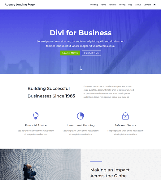 Divi es una opción popular entre los mejores temas de WordPress para agencias digitales. Es un tema multipropósito premium con un editor visual avanzado, perfecto para construir cualquier sitio web. También viene con una amplia biblioteca de plantillas editables de alta calidad.