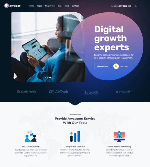 Ewebot es un tema de WordPress para SEO y agencias de marketing que es el mejor para desarrollar agencias digitales, estudios web, etc. Tiene tres diseños de página de inicio con un formulario de búsqueda y una imagen estática. Sin embargo, todos son responsive y se cargan rápidamente.