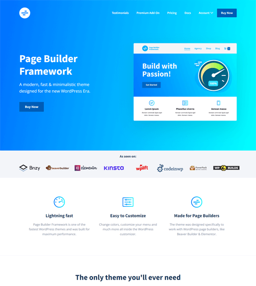 Otra popular herramienta de construcción web es Page Builder Framework. Se encuentra entre los mejores temas de WordPress para agencias digitales que puede utilizar para crear un sitio de agencia rápidamente. Puedes utilizar su personalizador de WordPress para diseñar diseños únicos en posts y páginas.