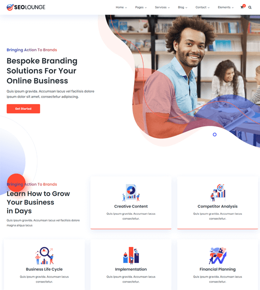 SEO Lounge es un impresionante tema de WordPress para SEO y empresas de marketing digital. Ofrece una gran variedad de demos y una colección ilimitada de diseños de páginas interiores. También puedes personalizar los diseños usando paletas de colores.