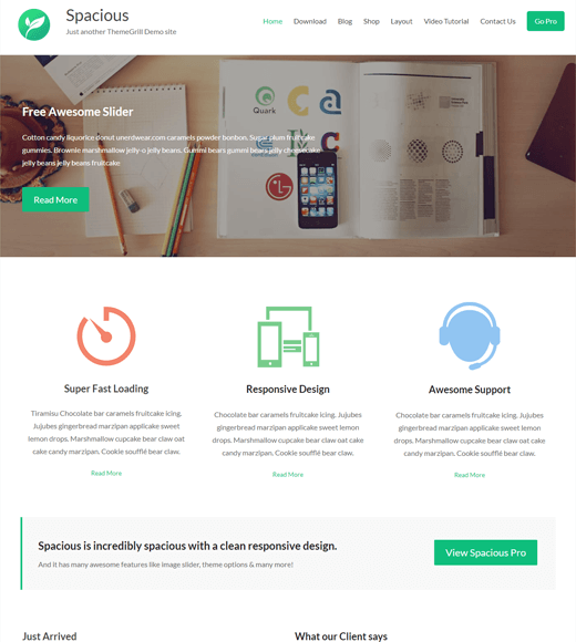 Spacious ofrece más de 30 sitios de inicio gratuitos, así que importa una demo y empieza a personalizarla usando el constructor de páginas de tu elección. También incluye widgets de temas específicos, como Llamada a la acción, Página única destacada, etc., que son útiles para los negocios en línea.
