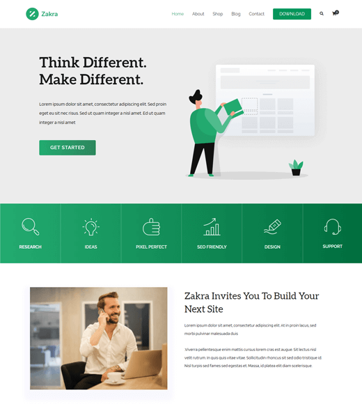 Si no estás seguro de qué tema elegir, te sugerimos que utilices Zakra. Es un tema ligero, moderno y multipropósito con compatibilidad esencial con plugins. Puedes importar una de sus plantillas de entre sus múltiples plantillas de WordPress para agencias digitales y ¡empezar a personalizar!