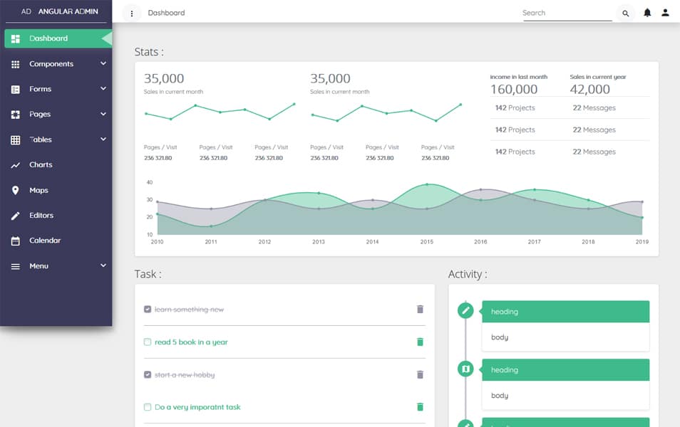 AdminPro Boostrap Lite es una versión lite que ofrece una plantilla de administración básica y sencilla para su aplicación. Utiliza Bootstrap 4 y ofrece widgets listos para usar, ejemplos de tablas, opciones de gráficos, etc.