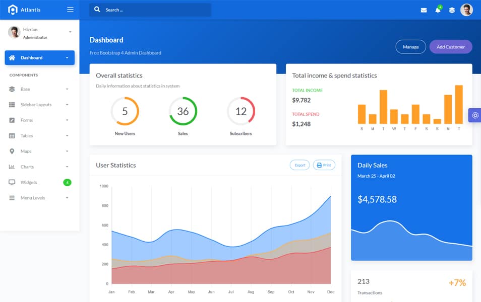 Si quieres probar la plantilla de administración Atlantis Bootstrap 4, entonces tienes que echar un vistazo a Atlantis-Lite, la versión gratuita. Es ideal para proyectos que requieren la visualización de datos en su núcleo. Ofrece dos diseños y también viene con muchos componentes de interfaz de usuario.