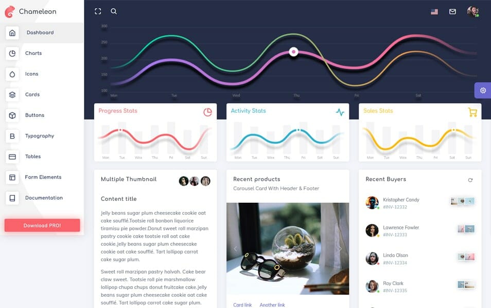 Chameleon es una plantilla de tablero de mando de Bootstrap, moderna y gratuita, que utiliza HTML5, CSS3, SASS, Bootstrap 4 y Gulp. Puede ser utilizado en diversos proyectos, incluyendo el comercio electrónico, CRM, Fitness, y así sucesivamente!