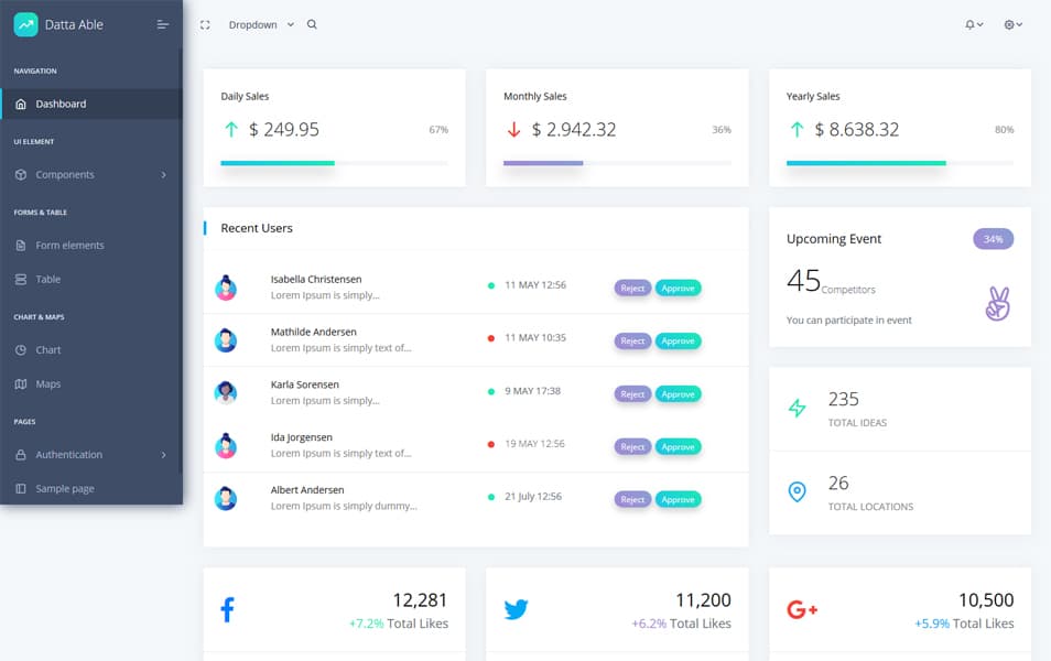 Datta Able Bootstrap 4 es una plantilla moderna que puede encajar en la mayoría de los proyectos modernos. Viene con un montón de componentes, incluyendo pestañas, insignias, botones, iconos, y así sucesivamente. Tiene una estructura de código ética y es fácil de usar y mantener.