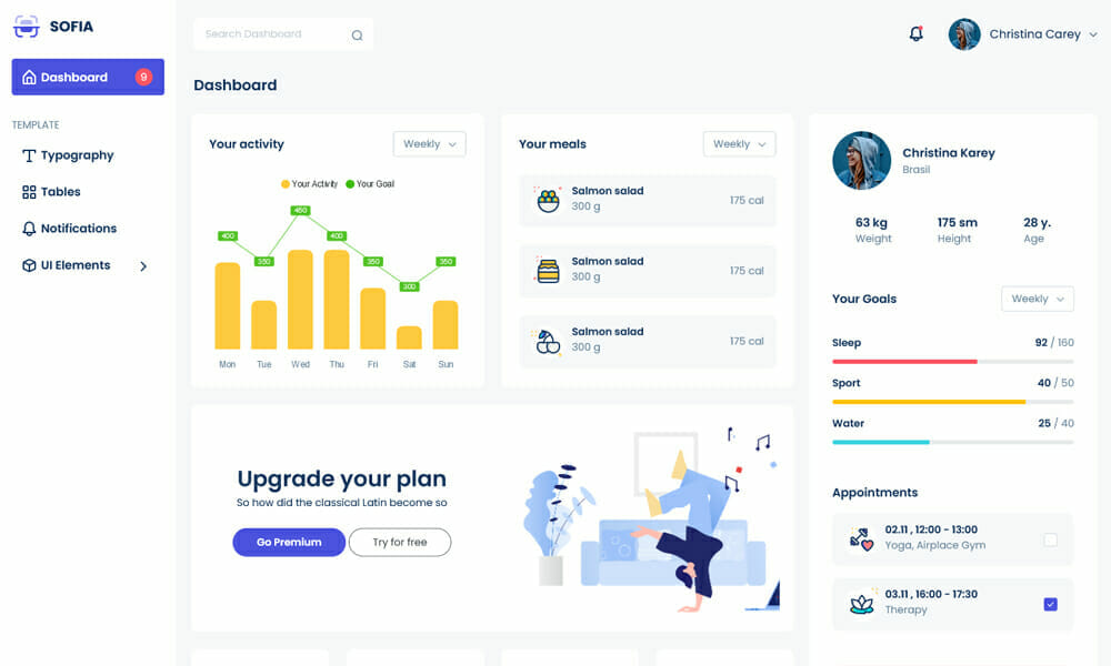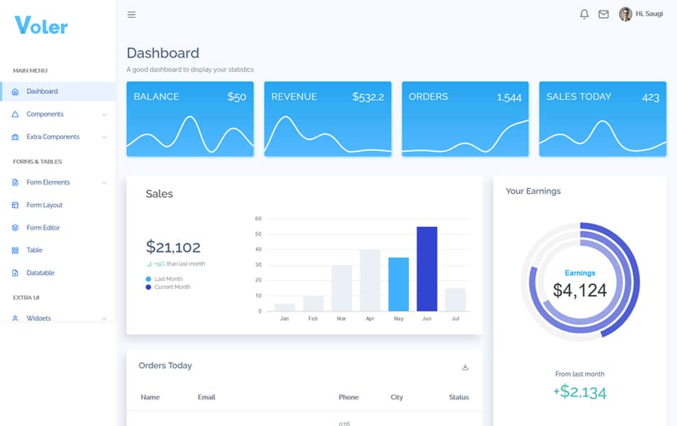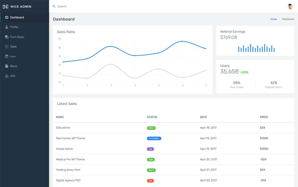 El tablero de mandos elegante es un kit de interfaz de usuario y plantilla de tablero de mandos de administración de uso gratuito. Utiliza tecnologías modernas, incluyendo HTML, JS y CSS. También es intuitivo, potente y personalizable.