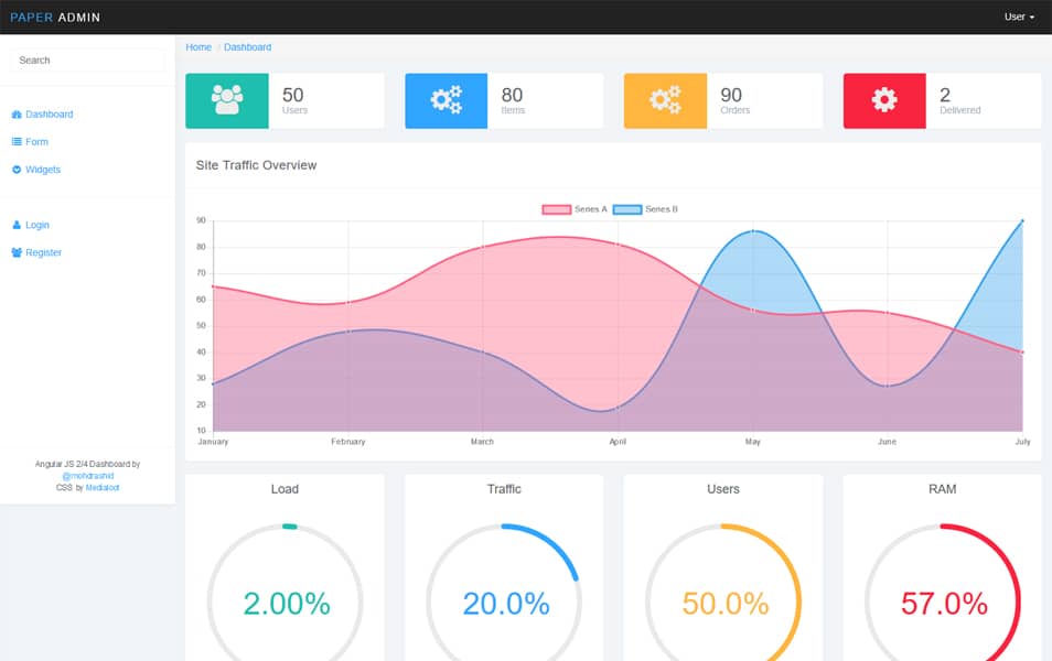 Ample Boostrap Admin Lite es un tablero de administración de Bootstrap accesible con características críticas como widgets, tablas, CSS de base Sass, opciones de gráficos y mucho más. La versión gratuita utiliza Bootstrap 3.3.7 mientras que la versión pro ofrece 4.2.1