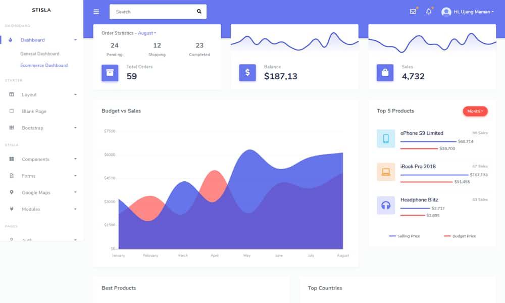 ModularAdmin es una plantilla de diseño de panel de control gratuita que puede utilizar en sus proyectos. Ofrece un diseño modular y es fácil de usar.