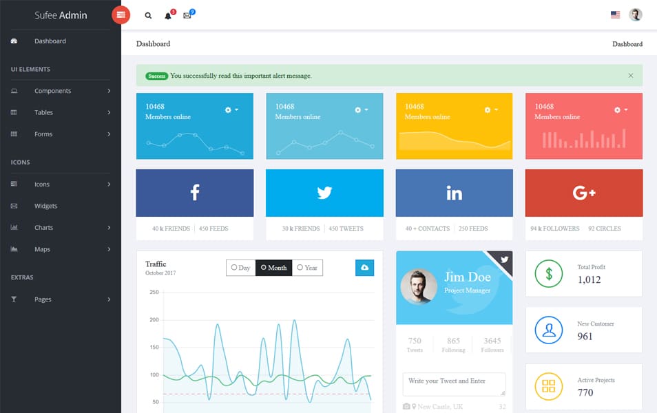 Sufee HTML5 Admin dashboard template es un diseño responsivo con grandes fragmentos de código. Se puede utilizar en diferentes aplicaciones
