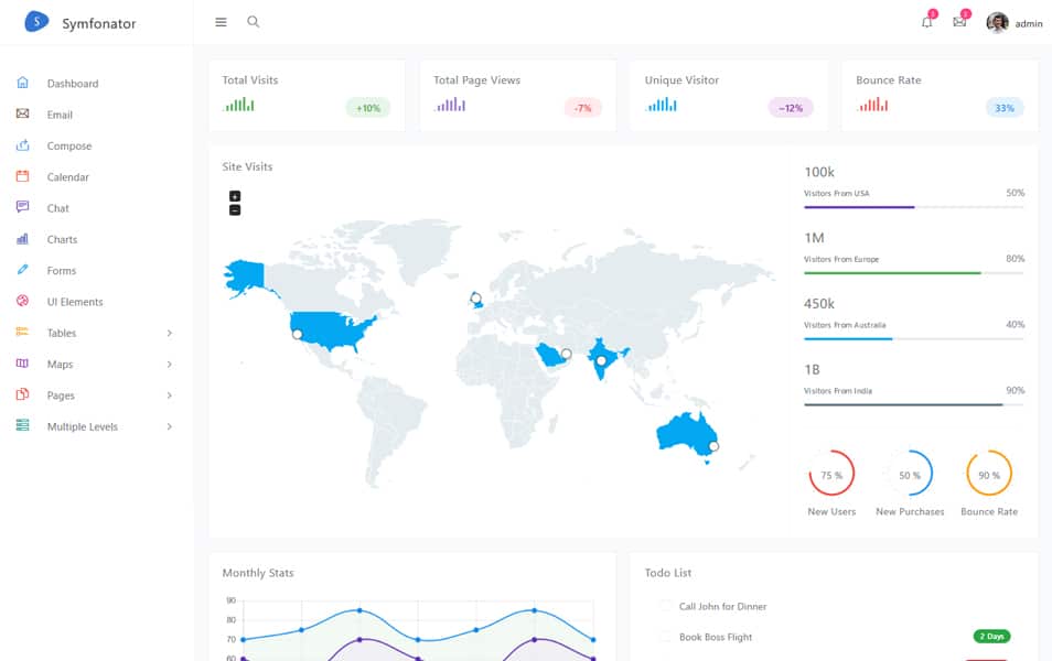Monster Bootstrap Admin Lite es otra plantilla gratuita para el panel de administración. Con más de 16K descargas, es bastante popular y te da acceso a un código fácil de modificar. También viene con una plantilla de 7 páginas, 10 componentes de interfaz de usuario, etc.