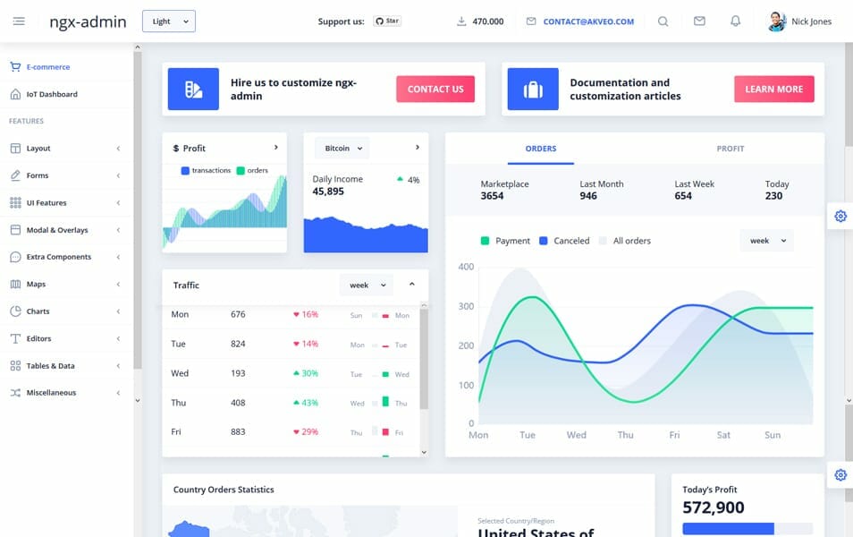 ngx-admin es otra excelente plantilla de diseño de panel de control. Ofrece un panel de control IoT, cinco diseños diferentes, formularios, funciones de interfaz de usuario, mapas, gráficos y mucho más. Puede editarlo según sus necesidades.