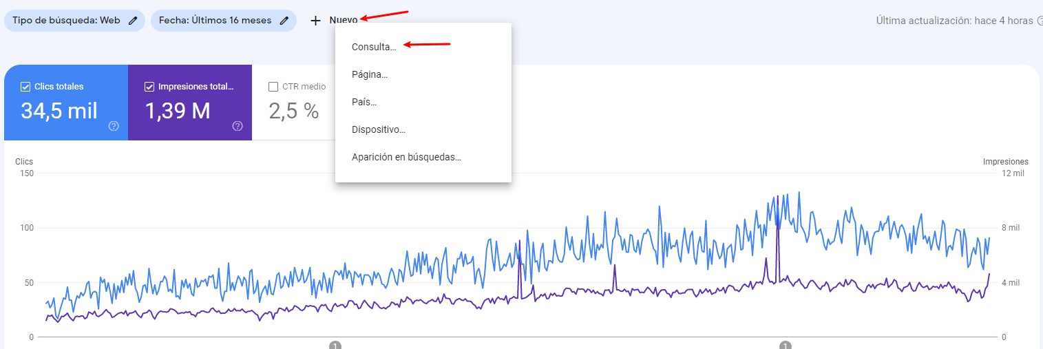 Entramos al Search Console y establecemos el tiempo que queremos analizar, que queremos analizar y en mi caso voy a poner los últimos 16 meses, ya que me interesa ver todas las long tail, también podrías poner menos fecha y ver las palabras clave long tail posicionadas más recientemente.