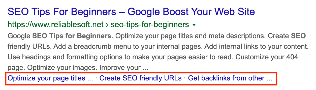 Google también muestra los enlaces de sitio para las publicaciones individuales. Los sitelinks de los posts hacen que tu snippet de búsqueda sea más atractivo para los clics.