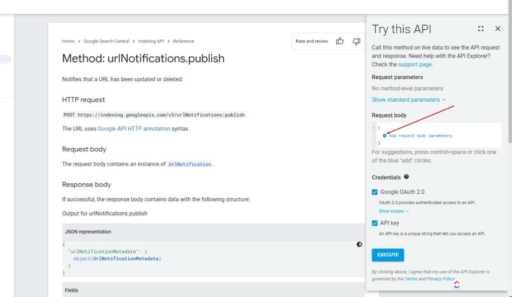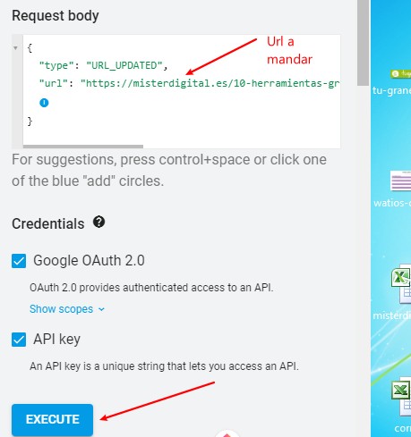 Para terminar incluye la url que deseas mandar a indexar entre las comillas del parametro url y le das al botón Execute.