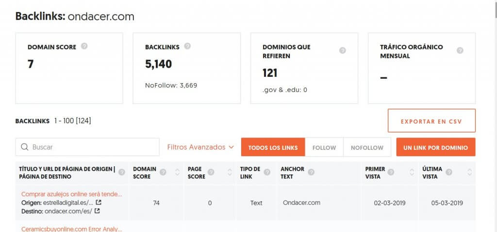Aquí puedes ver que tiene un total de 5140 , donde 3669 son nofollow un 71% aproximadamente. Pero los mas importante… 121 dominios de referencia. Esto que quiere decir que aunque tiene muchos enlaces les enlaza 121 dominios esto es por que un dominio te puede estar dando enlaces desde varios sitios de la página pero los mas importantes es la cantidad de dominios ya que quizás con menos enlaces pero mas dominios de referencia apuntando a ti web puedes tener incluso mejores resultados. En el listado te aparecen por defecto un enlace por dominio pero lo puedes desmarcar para verlos todos, ademas puedes filtrar por los que son follow y nofollow. Además con el botón exportar csv te los puedes descargar en tu PC e irlos trabajando poco a poco.
