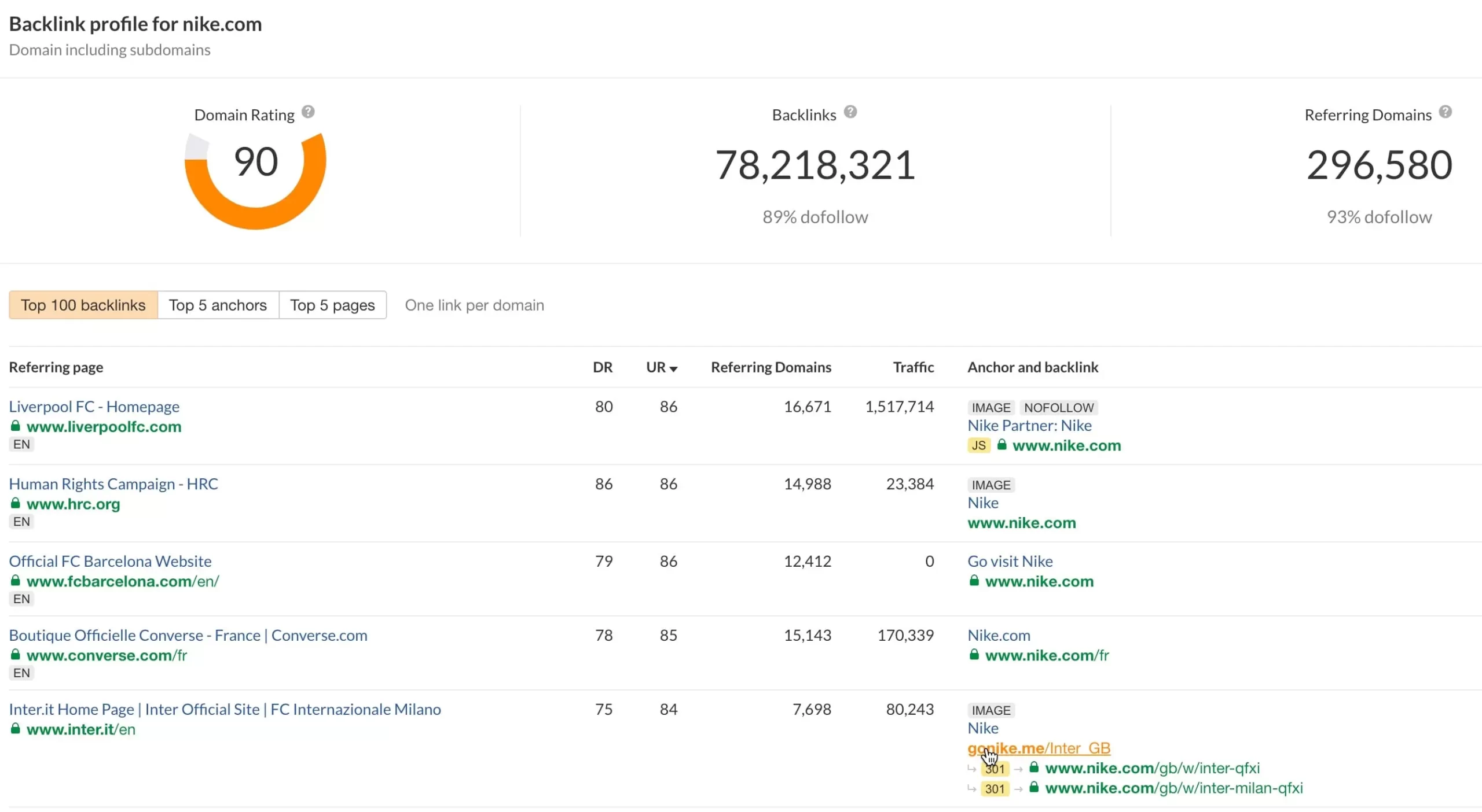Al introducir un dominio en el comprobador de backlinks de Ahrefs se obtiene un informe completo repleto de información útil. El resumen incluye la calificación del dominio del sitio web, el número total de backlinks y su porcentaje de enlaces dofollow.