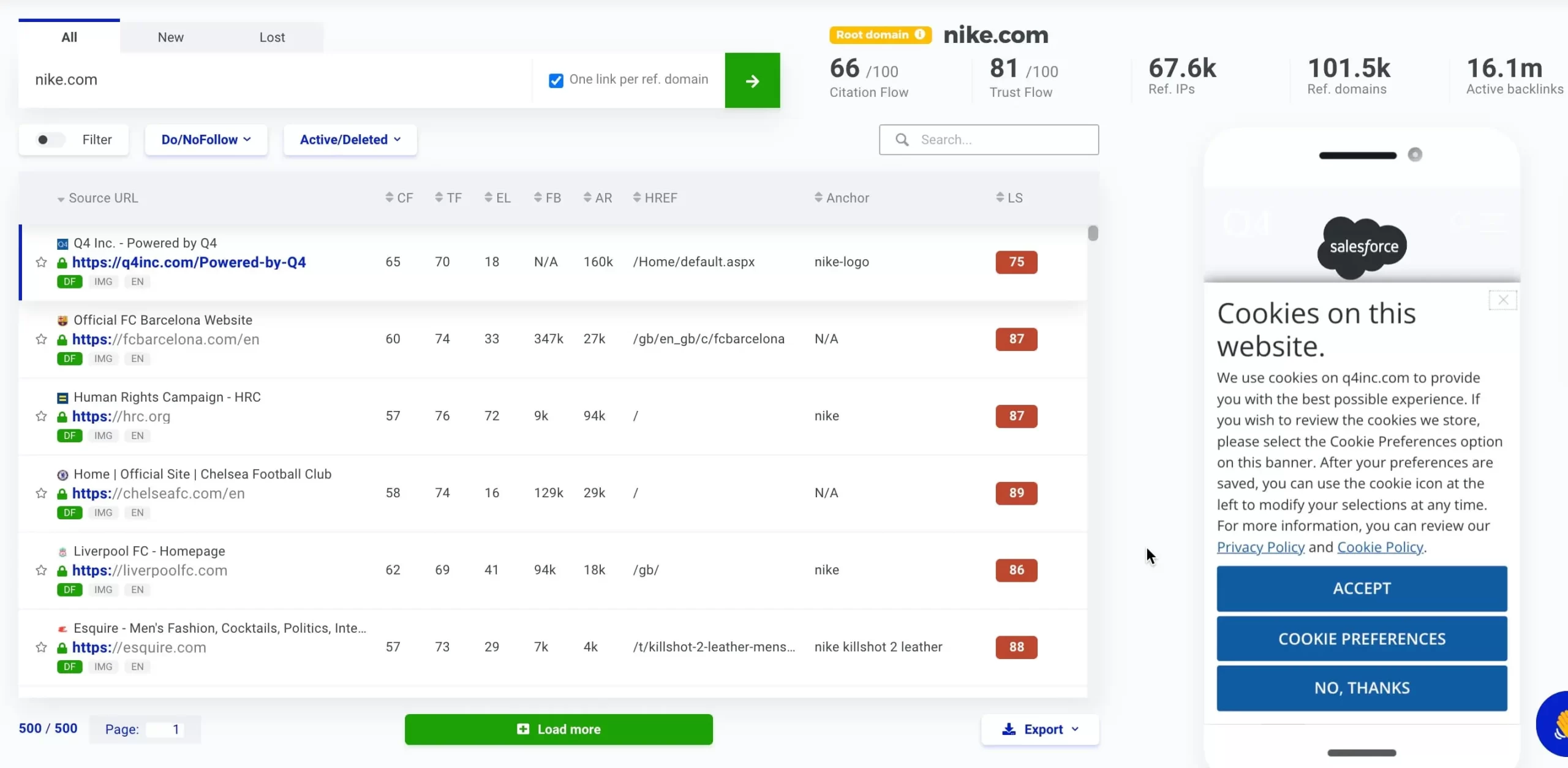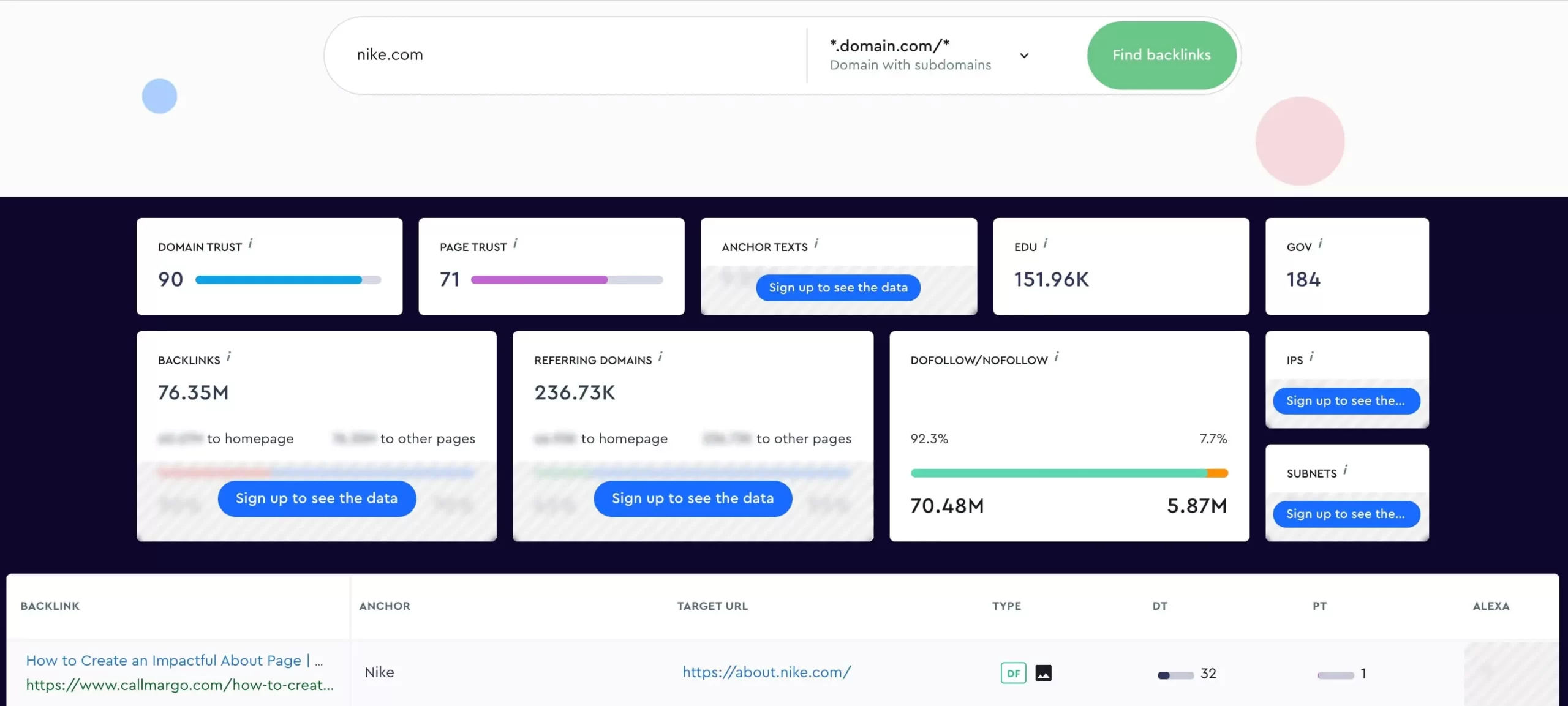 Al hacer clic en el botón para ver el total de backlinks de cada sitio web, se obtiene una visión más específica de los enlaces que dirigen a los usuarios a su sitio. También verás cuáles de los enlaces son “dofollow” o “nofollow”.
