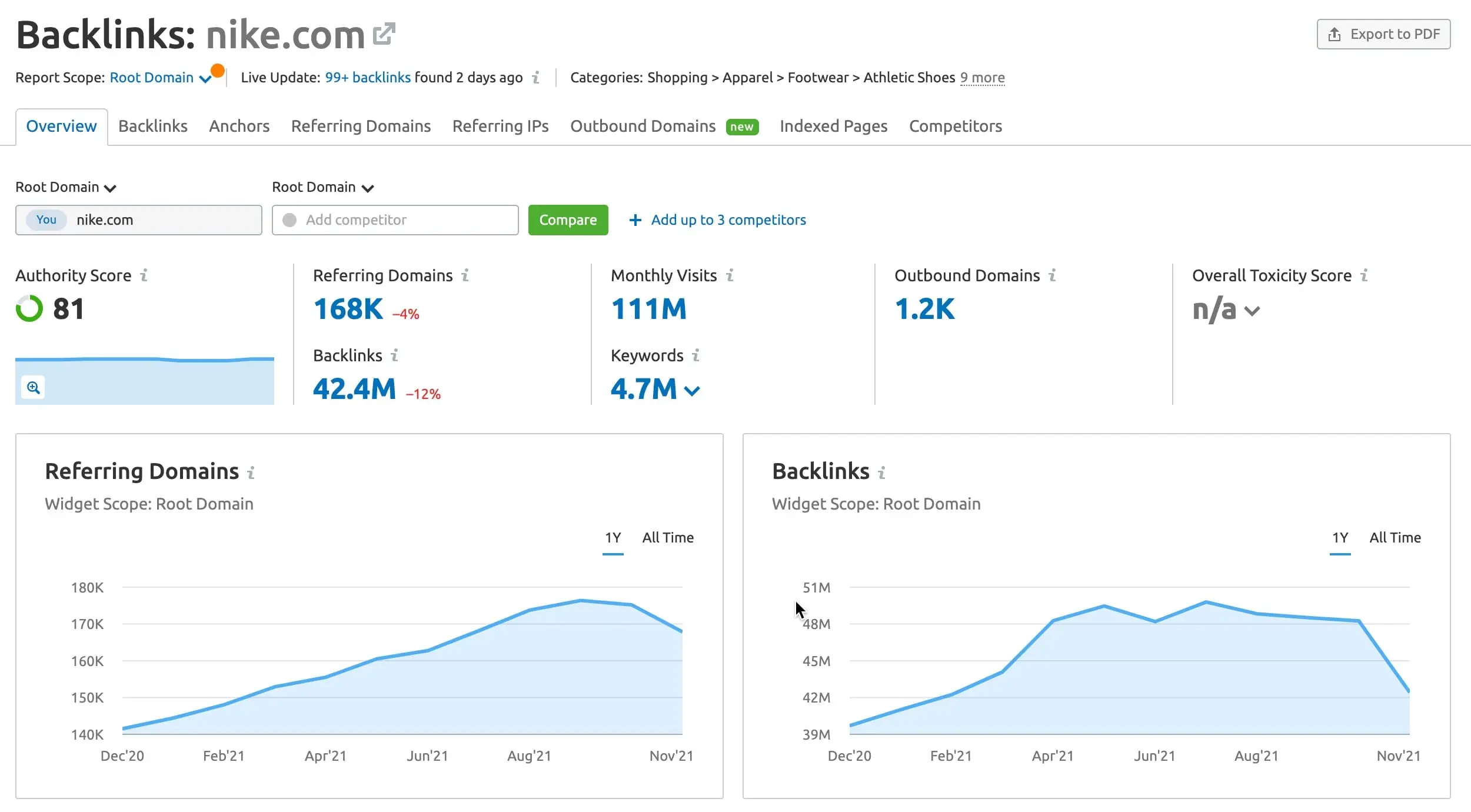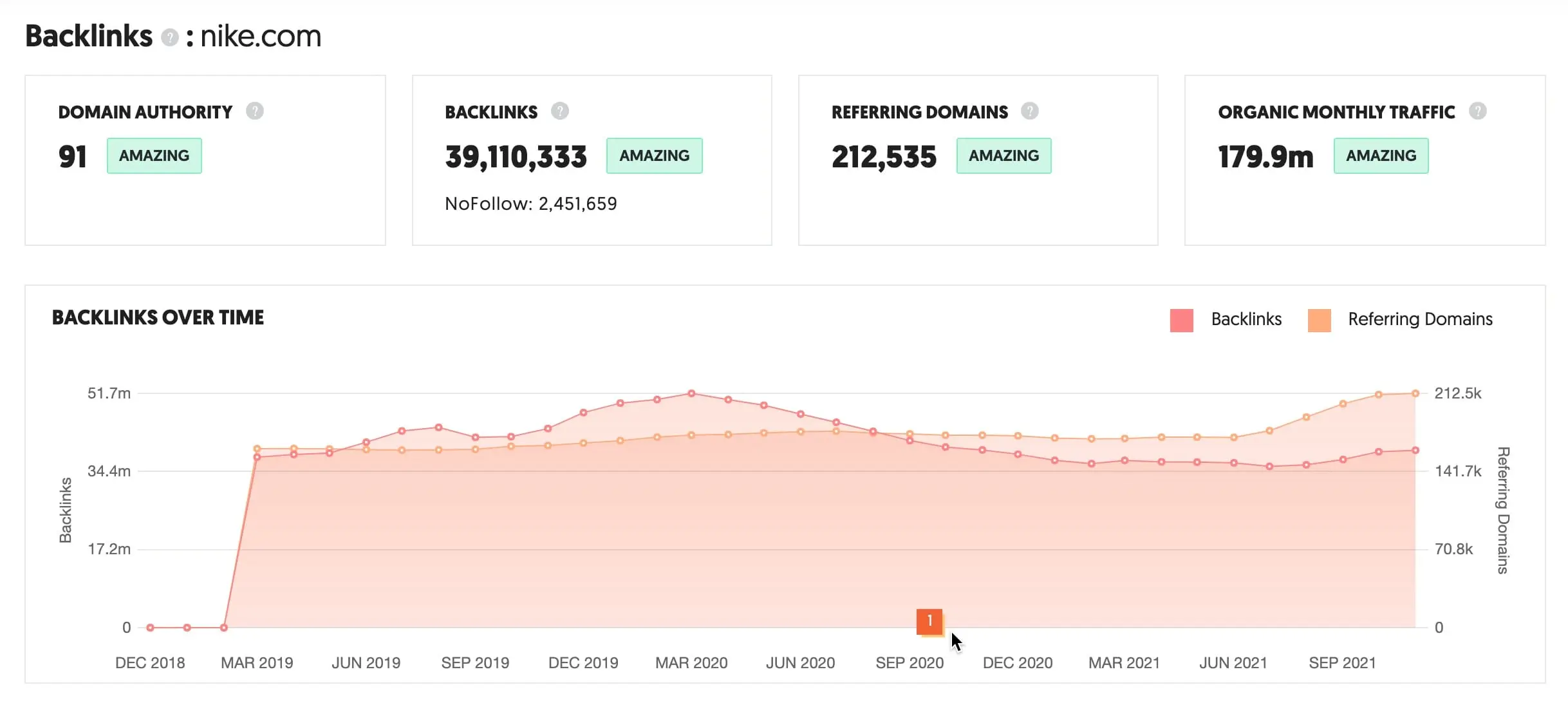 Cuando introduzcas la URL de tu sitio web o la de un competidor, verás una pestaña “Overview”. Aquí, puedes ver la puntuación de autoridad de tu sitio, el número de dominios de referencia totales y backlinks .