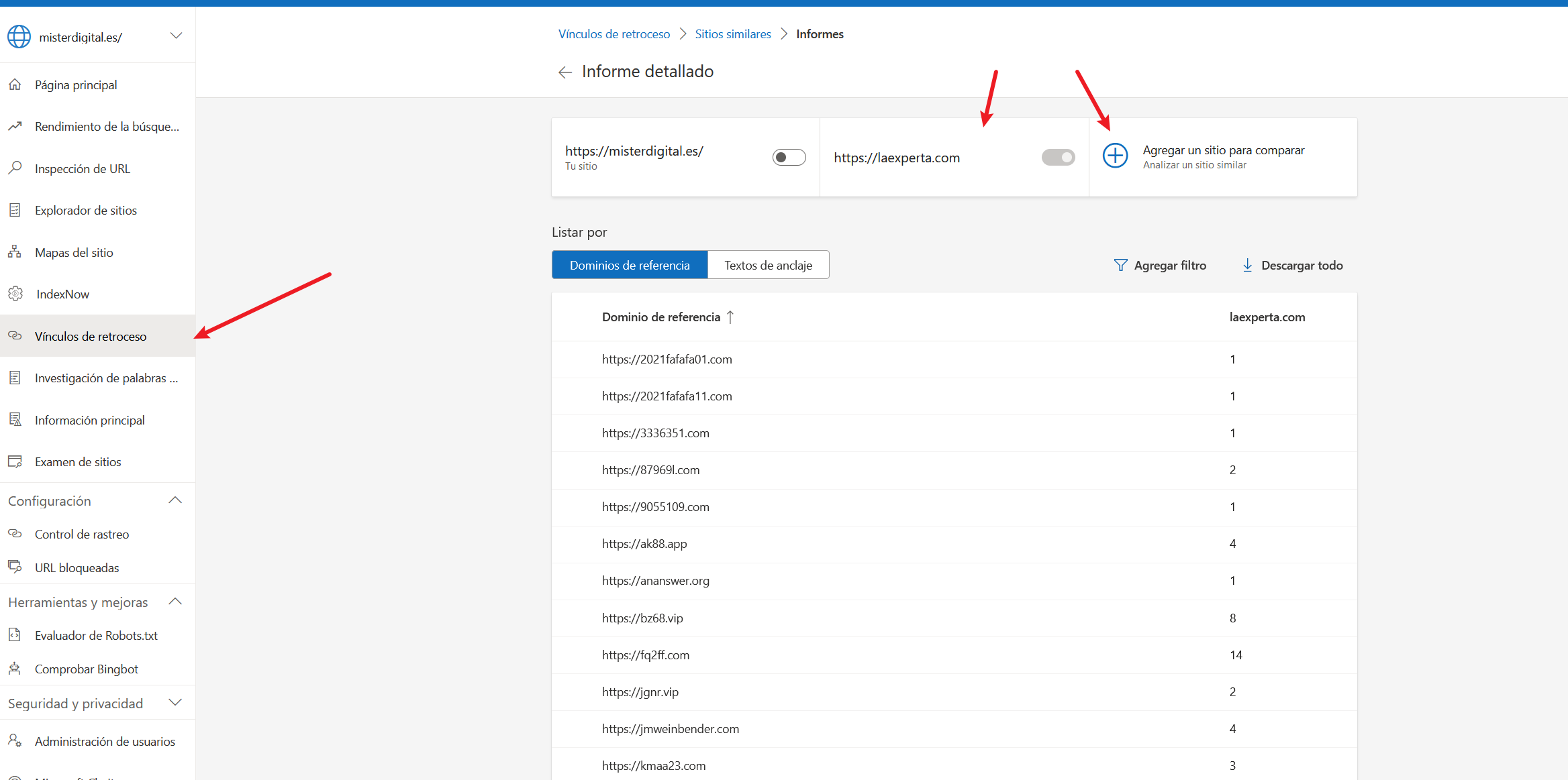 Como ya vimos aquí con Bing Webmaster Tools podemos ver nuestros enlaces, los de la competencia y compararlos entre si.