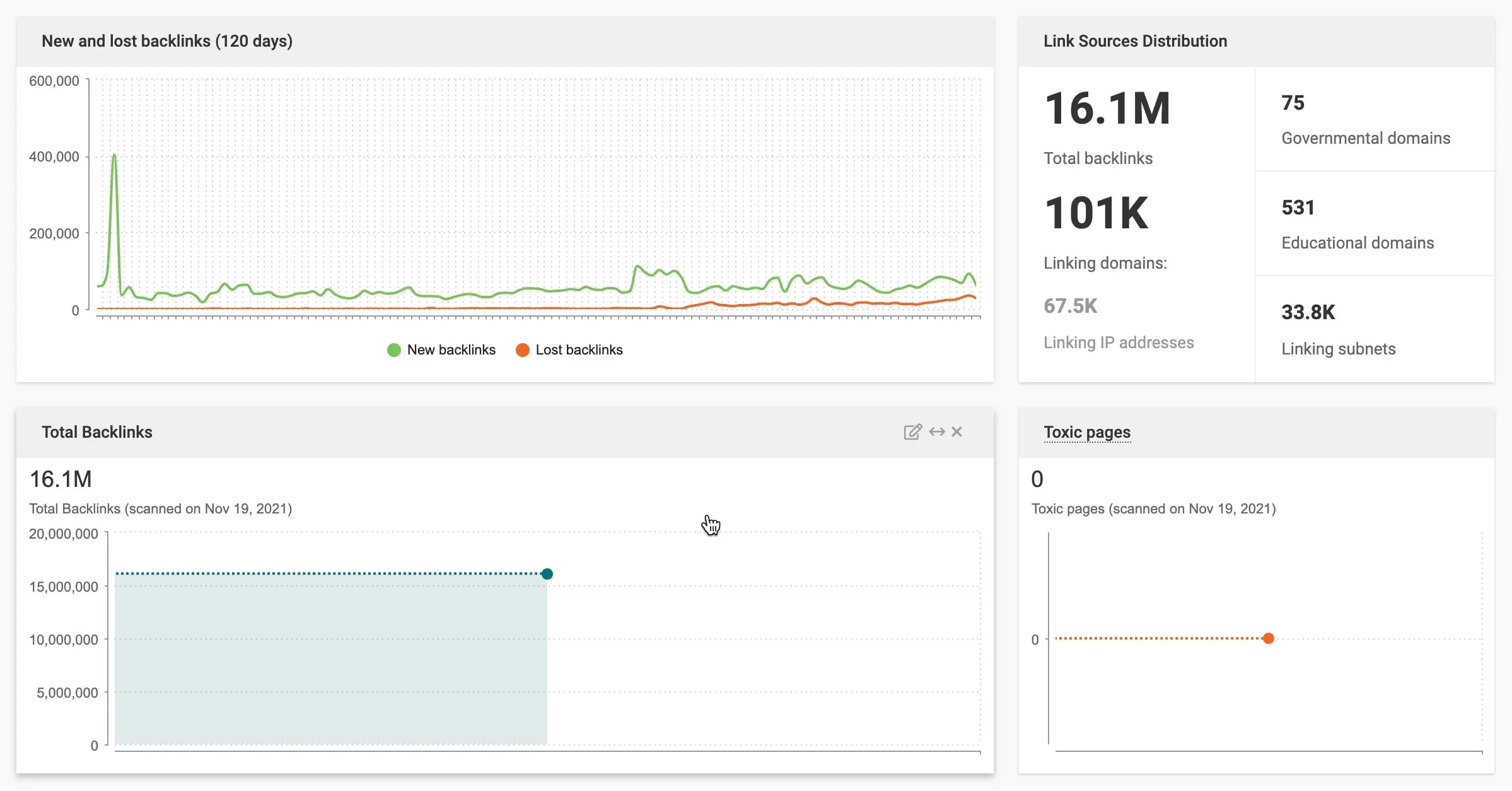 - Puntuaciones exhaustivas de los dominios: Comprueba una serie de métricas para cada dominio que enlaza con su sitio