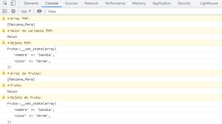 $output .= "<script>console.warn( 'Objeto PHP:' );";