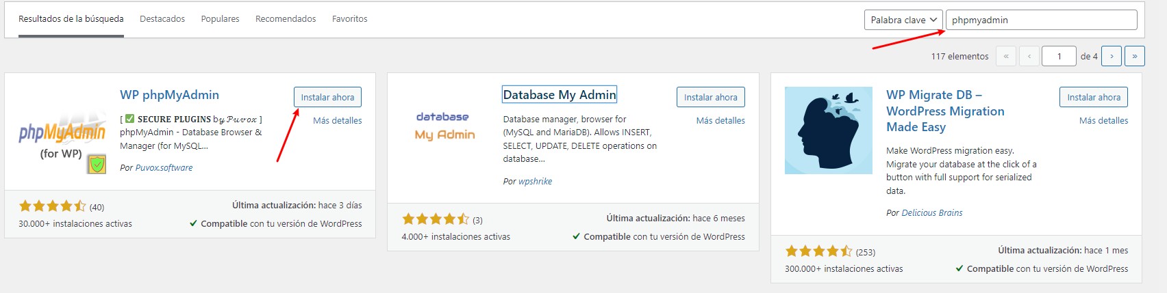 Después en el buscador de plugins buscamos phpmyadmin , localizamos el plugin WP phpMyAdmin y pulsamos en el botón Instalar Ahora