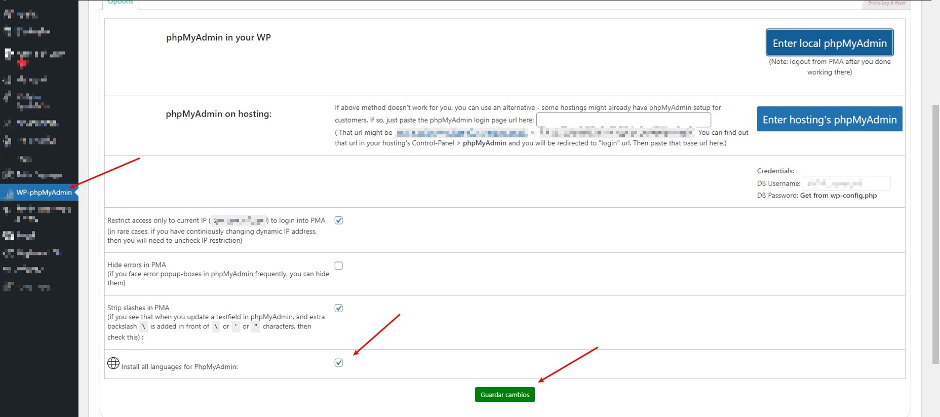 En después de activar el plugin se nos creará en el menú un item nuevo llamado WP-phpMyAdmin , nos dirigimos ahí y vamos a instalar los idiomas picando en la opción Install all languages for PhpMyAdmin y le damos a Guardar Cambios