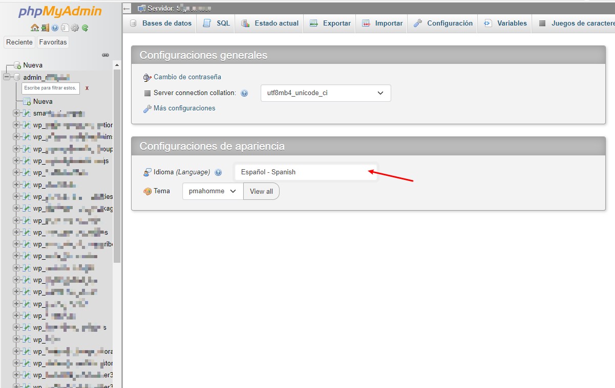 Y ya tenemos accesible el panel de phpMyAdmin para cuando queramos desde el propio WordPress, por ultimo si queremos podemos ponerlo en español en las configuraciones de apariencia.