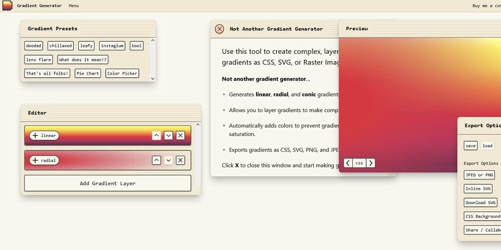 Muchas empresas de primera línea, como Instagram, utilizan ahora efectos de degradado en sus iconos y logotipos. los degradados son mucho más atractivos que los simples colores. Cuando se trata de crear grandes degradados es necesario tener cierto nivel de conocimiento en la teoría del color. Hemos encontrado algunos grandes generadores de gradientes y bibliotecas por ahí para hacer este trabajo más fácil. Usando estas herramientas de gradientes puedes generar gradientes en muchos formatos que quieras, puedes usarlos en tus diseños y CSS. La biblioteca de gradientes te ayuda a copiar gradientes pregenerados para tus diseños.
