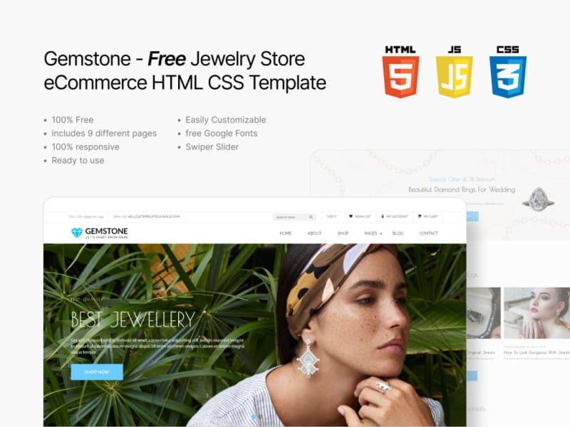 Gemstone es una Plantilla eCommerce HTML CSS gratuita de TemplatesJungle. Se adapta mejor a cualquier tienda de joyería o tienda de moda. Gemstone es una plantilla HTML de comercio electrónico completamente gratuita y 100% responsive. Tiene elementos de diseño para mostrar sus productos e información sobre su tienda de comercio electrónico. Incluye un slider de productos, página de detalles de productos, carrusel de productos, slider de testimonios, bloques de anuncios, formulario de contacto y páginas de blog.