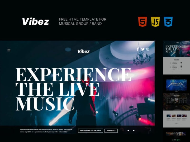 Vibez es una plantilla gratuita HTML5 CSS3 para grupos musicales o bandas por TemplatesJungle. Tiene todos los elementos necesarios para cualquier sitio web de banda como giras y secciones de vídeo. Esta plantilla HTML tiene todos los elementos para crear cualquier número de páginas adicionales. Entre sus características se incluyen 8 páginas diferentes totalmente responsivas, un pase de diapositivas a pantalla completa, un menú hamburguesa, una lista de giras, páginas de tienda y una funcional página de contacto.