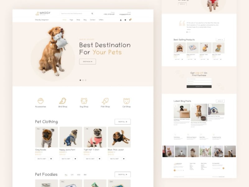 Waggy es una plantilla HTML Bootstrap 5 gratuita para cualquier tienda de comercio electrónico de TemplatesJungle. Es adecuado para cualquier tienda de comercio electrónico, sitio web de compras en línea, tienda de mascotas, sitio web de compras, carrito de compras en línea, tienda de ropa, tienda de juguetes, etc. Principalmente está especialmente diseñado para tiendas de mascotas. Tiene un diseño limpio, minimalista y bonito que se adapta a las tendencias actuales de diseño moderno. Puede utilizar esta plantilla para mostrar con elegancia sus productos. Tiene un carrusel de productos bien diseñado, presentación de diapositivas de productos, sección de boletín de noticias, y muchos más que lo convierte en la mejor plantilla de sitio web de comercio electrónico libre.