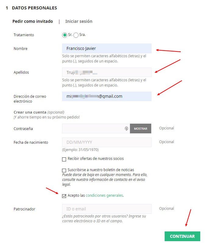 Incluimos los datos personales, aquí te señalo los que son imprescindibles. Cuando los hemos rellenado le damos a “Continuar”.