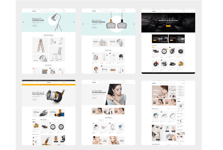 • 19+ Diseños de página de inicio: Cada uno con un enfoque único no solo en la página principal, sino también en las páginas de productos, categorías y login.