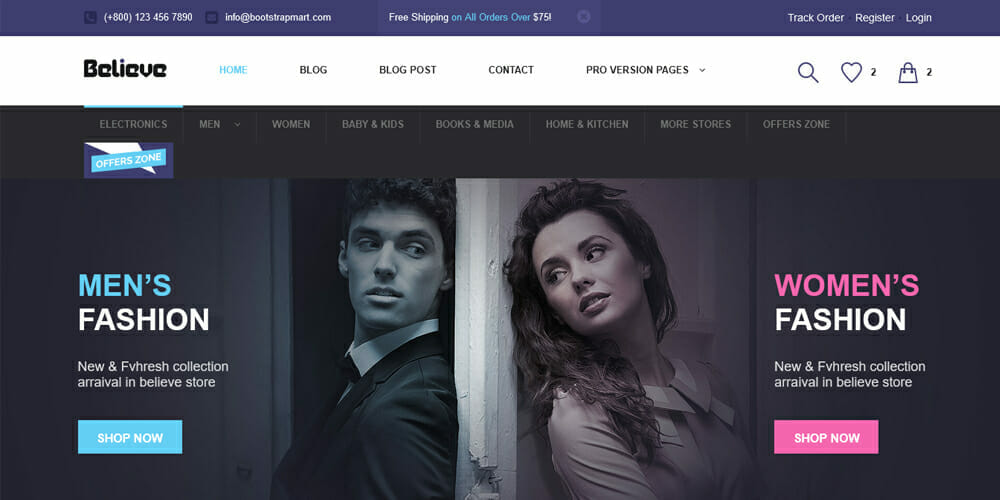Believe es una nueva plantilla de comercio electrónico responsiva y hermosa basada en Bootstrap 3.3.7. Ha sido diseñado para ser una solución perfecta para cualquier negocio de comercio electrónico, pero también puede ser utilizado como una plantilla de sitio web de propósito general. La plantilla está construida con las últimas tecnologías como HTML5, CSS3 y jQuery UI, lo que la hace totalmente responsiva y garantiza la compatibilidad entre navegadores, sin dejar de ser lo suficientemente ligera como para cargar rápidamente.