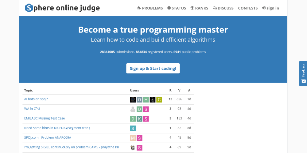 Si quieres crear tu propio juego, convertirte en un desarrollador profesional, o simplemente ser la persona más inteligente de tu oficina, SPOJ es el camino a seguir. Con más de 3000 problemas y más, perfeccionarás tus habilidades en nichos de programación como las matemáticas, la física, el procesamiento de imágenes y mucho más. Únete a los más de 250k estudiantes que utilizan SPOJ para saber lo que significa ser verdaderamente hábil en la programación.
