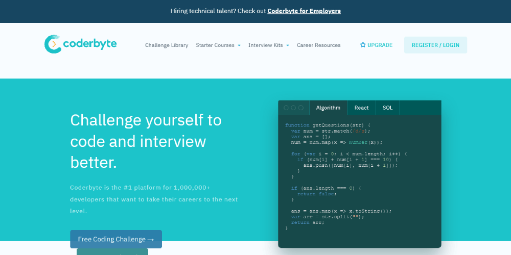 Coderbyte es una plataforma para que los desarrolladores aprendan, practiquen y se entrevisten para puestos de trabajo de alto nivel. Aprende de mentores experimentados de las principales empresas tecnológicas. Practica tus habilidades con preguntas desafiantes de codificación. Obtén puestos de trabajo basados en tus intereses y nivel de experiencia. Se acabaron las noches de insomnio en la búsqueda de empleo. Coderbyte es una plataforma gratuita que puede ayudarte a encontrar un trabajo con sólo unos clics.