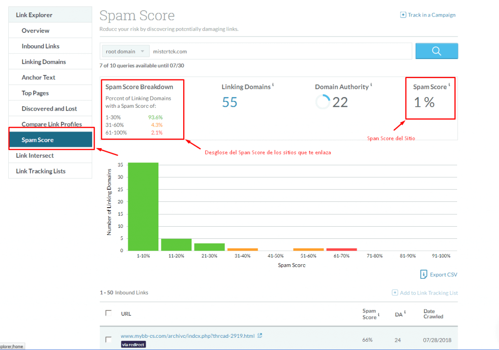 En la parte derecha puedes ver el Spam Score del sitio web que estas comprobando, en la izquierda el desglose de Spam Score de los sitios que lo enlazan. En la parte de abajo se puede ver el listado de los enlaces entrantes al dominio, lo malo es que para verlos todos te tienes que hacer con una cuenta profesional de Moz.