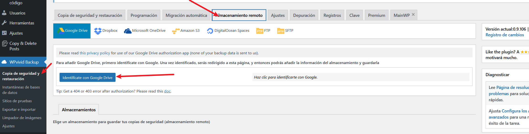 En esté caso voy a mandar las copias a Google Drive con lo cual vamos a preparar el almacenamiento remoto. Para ello nos vamos a la pestaña Almacenamiento remoto y después pulsamos en Indentifícate con Google Drive