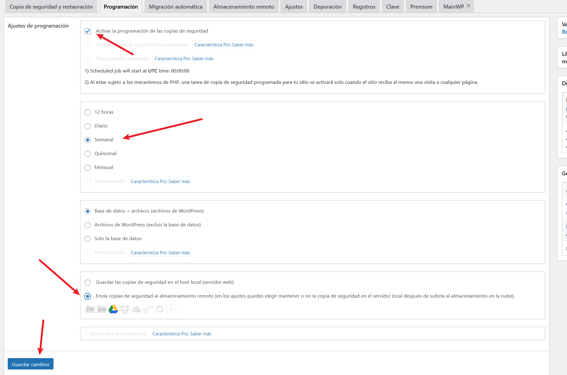 Para esto nos vamos a la pestaña Programación , activamos la opción Activar programación de las copias de seguridad . Después seleccionamos la frecuencia, para esto tienes que tener en cuenta que Vivid Backup te va a guardar un maximo de 3 copias en tu almacenamiento con lo cual si hace una copia y ya hay 3 almacenadas eliminará automáticamente la copia mas antigua, con lo cual dependiendo de los cambios que se hagan en tu web puedes cambiar la frecuencia, en el caso de este tutorial es una web que no tiene muchos cambios con lo cual le voy a poner semanal, pero por ejemplo si tienes un ecommerce con muchas ventas y registros de usuarios tendrías que ponerlo diario o incluso cada 12 horas. Por ultimo seleccionamos Envia la copia de seguridad a almacenamiento remoto y pulsamos Guardar Cambios