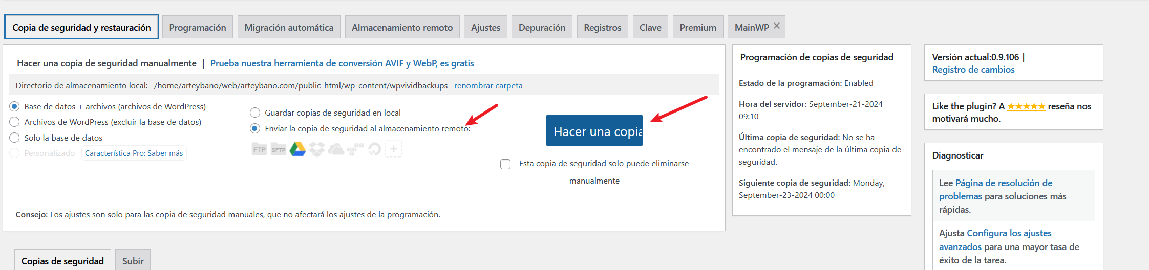 Las copias de seguridad también se pueden hacer manualmente. Cuando configuras el plugin te recomiendo que hagas también una copia de seguridad manual y así la primera ya la tienes hecha. En mi caso cuando voy a actualizar algo comprometido o hacer cambios grandes hago una copia manual siempre antes tambien. Para hacer la copia de seguridad manual nos vamos la pestaña Copias de seguridad y restauración seleccionamos Enviar copia de seguridad al almacenamiento remoto y pulsamos en Hacer Copia