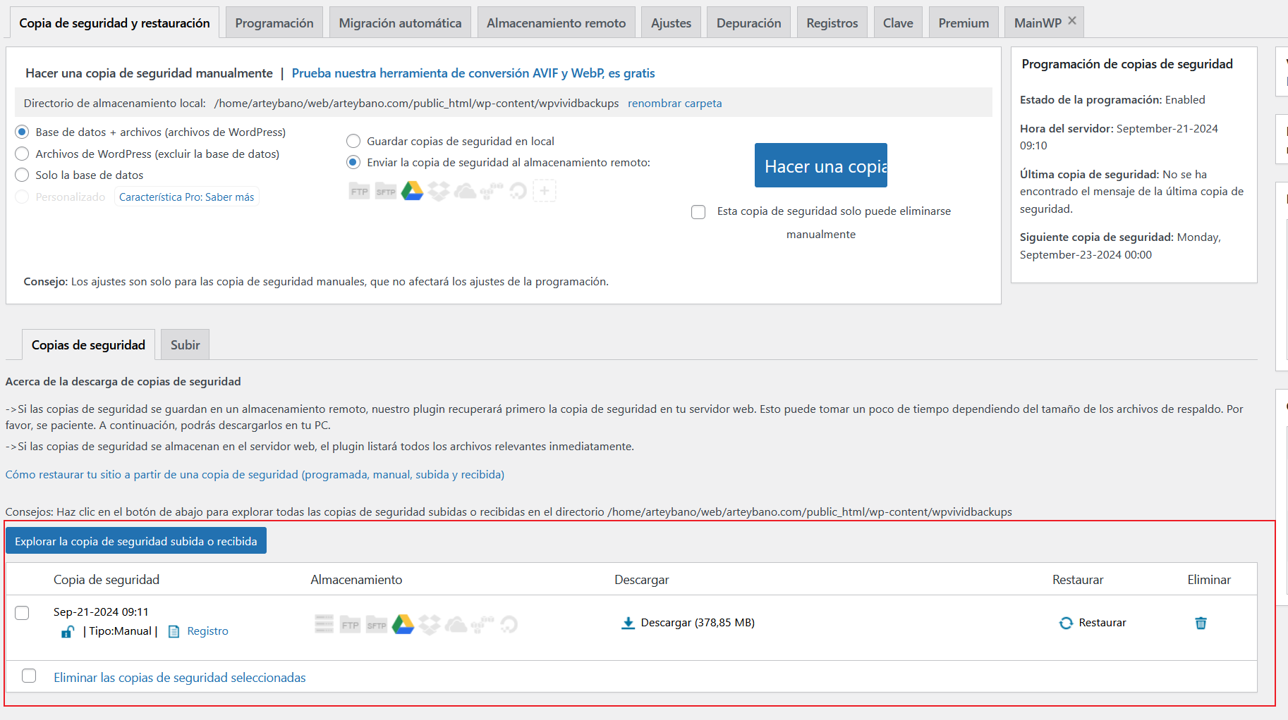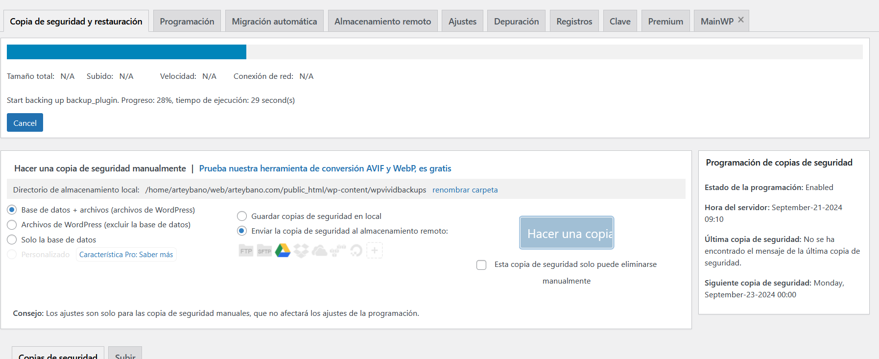 Probé WPvivid en un sitio bastante grande, con más de 2000 URLs y 12 GB de archivos (incluyendo imágenes, plugins y otros datos), y el plugin manejó las copias sin ningún inconveniente. A diferencia de otras opciones, WPvivid maneja sitios de gran tamaño sin problemas.